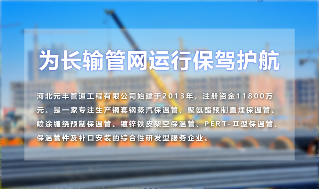 河北元豐管道工程有限公司始建于2013年,注冊資金2218萬元。是一家專注生產鋼套鋼蒸汽保溫管、聚氨酯預制直埋保溫管、噴涂纏繞預制保溫管、鍍鋅鐵皮架空保溫管、PERT-Ⅱ型保溫管、保溫管件及補口安裝的綜合性研發(fā)型服務企業。